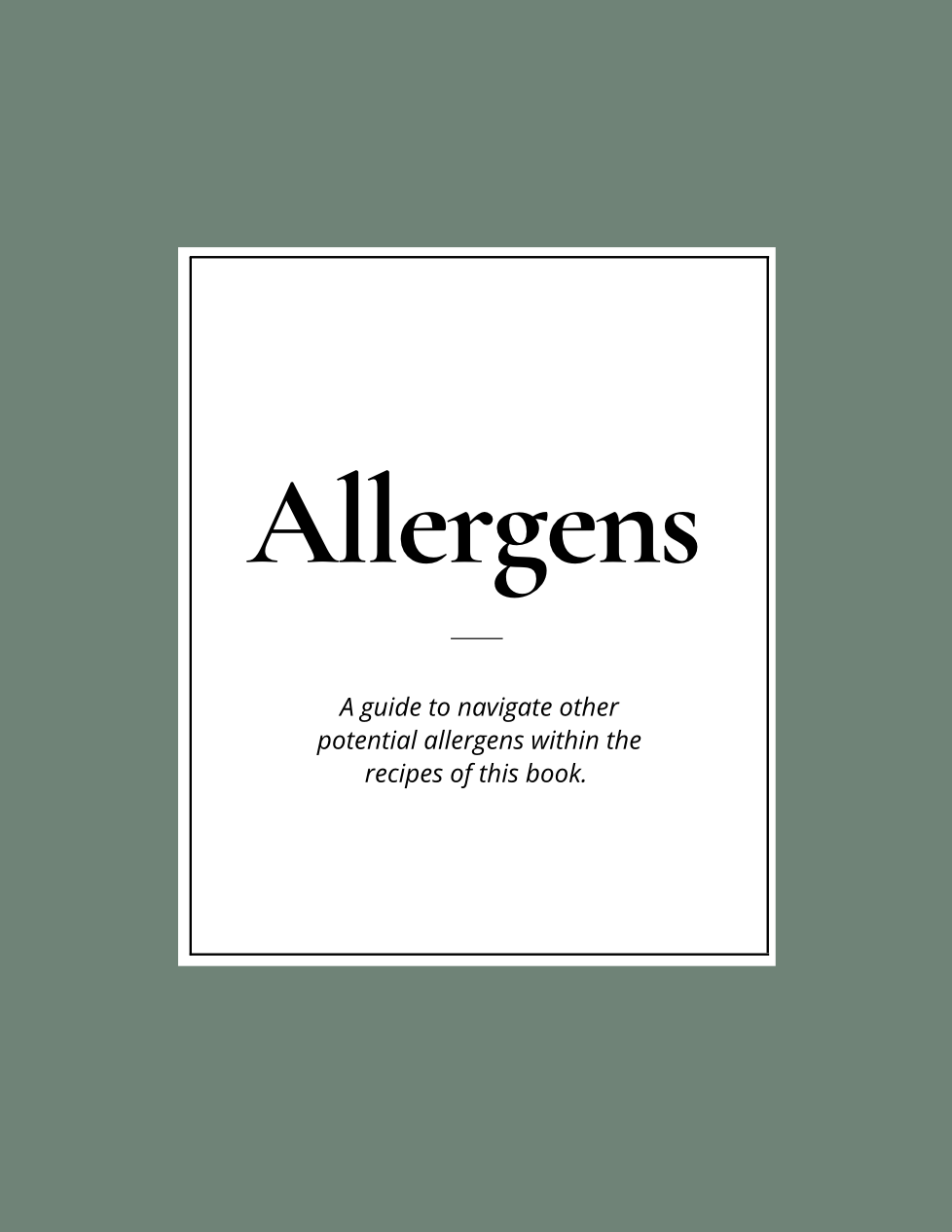 Unfortunately, Gluten isn’t the only allergy that needs to be navigated in today’s day and age - I have you covered!! Each cookbook comes with its own allergen guide that navigates additional allergens like; dairy, eggs, oats, nuts etc. You can check out the guide below.